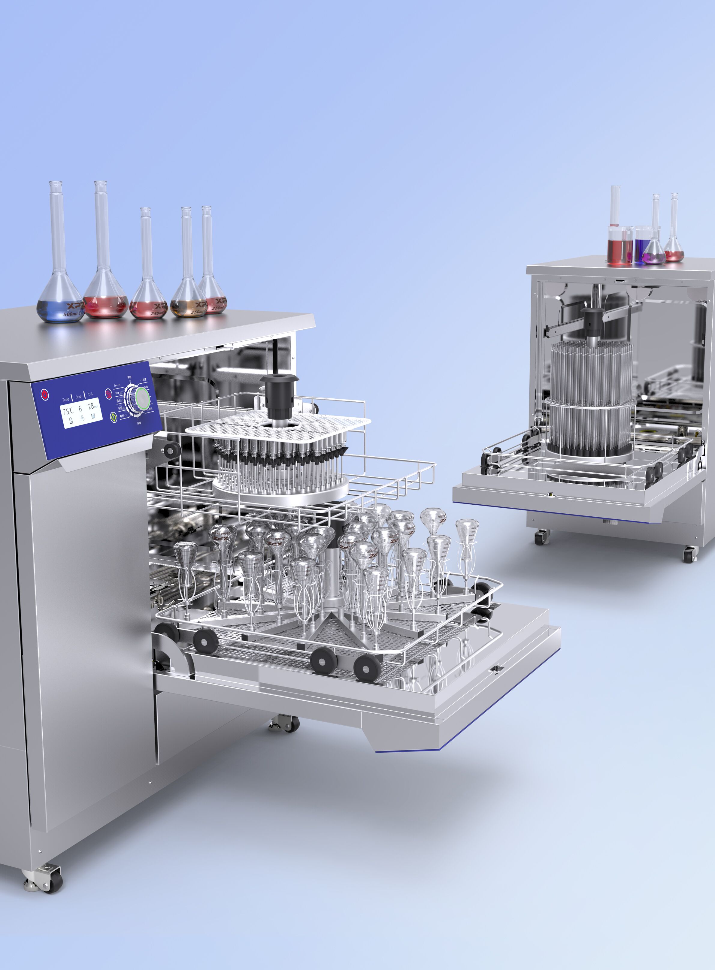使用用途:用于實驗室玻璃、陶瓷、金屬或塑料等材質器皿的自動清洗及烘干,同時可以清洗實驗室容量瓶,進樣小瓶,廣口瓶、三角瓶、量筒、雞心瓶、比色管、培養皿等實驗室器皿